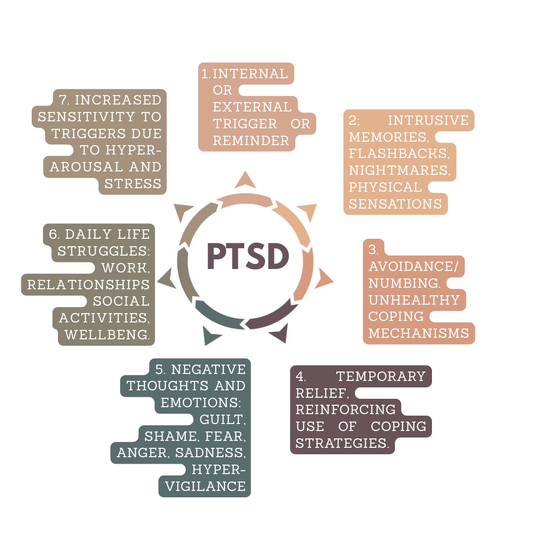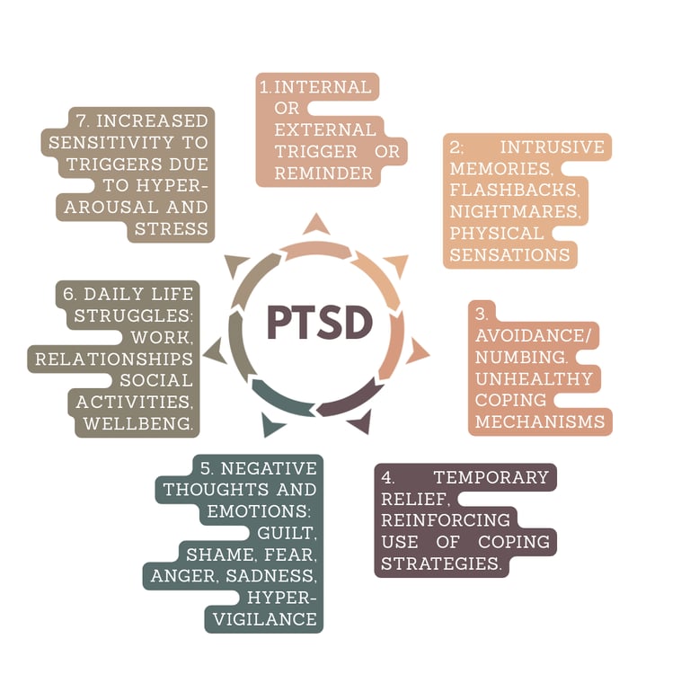 3. Coping Response: avoidance, numbing, overworking, substances.