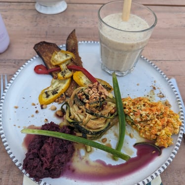 At this "Plant-based Nervous System Reset Retreat" (*Samadhi Lodge, bookyogaretreats.com*), I was immediately welcomed by the warm embrace of the hosts, Claudia and Neeltje. They were unlike anyone I had ever met before honestly, and it was quite confronting being around bold, confident women that weren't afraid to take up space, talk openly about their feelings, and express themselves in a physical sense. Their energy was so infectious and inspiring, I naturally found myself admiring them both so much. On this trip, I reconnected with my true Self. Something I hadn't really done or tried to do before. Through Yoga, Somatic Dance, Breath work, Journalling, Meditation, Reading, Nature bathing, Sound bathing and hiking, I actually felt a glimmer of hope and inspiration: what I wanted my future to look like.