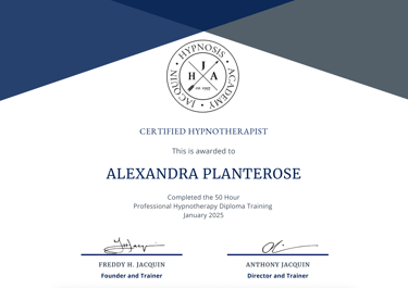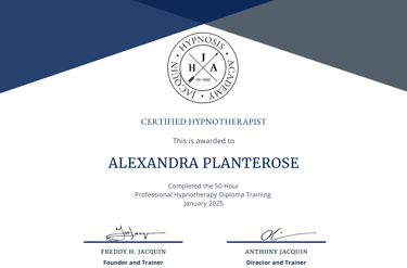 I’m a qualified Hypnotherapist (Dip. Hyp), awarded a Professional Hypnotherapy Diploma through the Jacquin Hypnosis Academy; an internationally recognised school known for its evidence-based and experiential approach to hypnosis. This training included over 50 hours of live mentoring, practical assessments, and hours of practice focused on subconscious change, communication skills, and client safety.