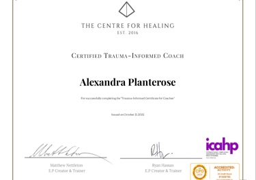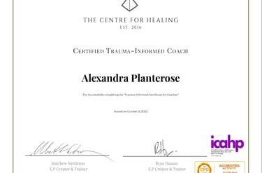 I also completed Trauma-Informed Coaching Certification with The Centre for Healing, a programme grounded in the neurobiology of trauma, emotional processing, and nervous system regulation. This training explored how trauma shapes identity, behaviour, protection mechanisms, and subconscious patterns, as well as how to support clients in building awareness, self-compassion, and internal safety.